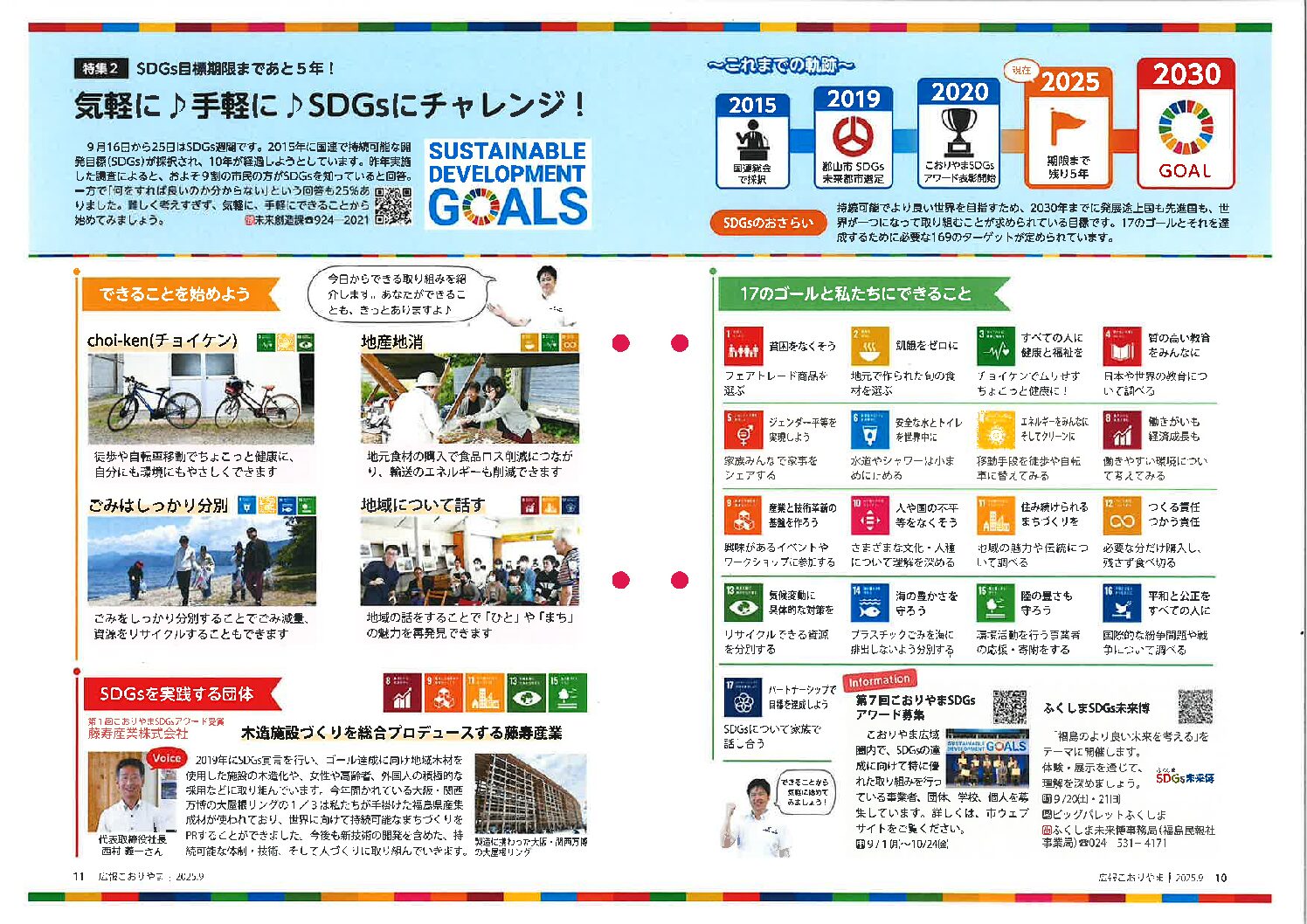 「広報こおりやま」に掲載いただきました 2025年9月3日 「広報こおりやま」2025年9月号にて、 「SDGsを実践する団体」として藤寿産業の記事を掲載いただきました。 20250903120612 今後とも、持続可能なまちづくりに貢献して参りたいと存じます。